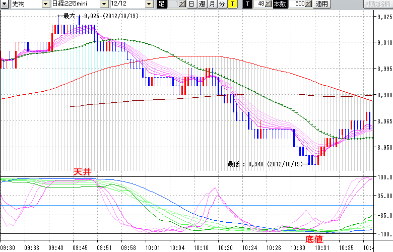 2012/10/19 - tensokoさんの株式ブログ。タイトル:「【10/19 日中の株価の天底】」 本文:【10/19 日中の株価の天底】 ↓クリックで画像拡大↓ ↓クリックで画像拡大↓ ※指標ラインの密集点が天底・転換点を示します。指標の見方日経225mini先物チャート(上) :