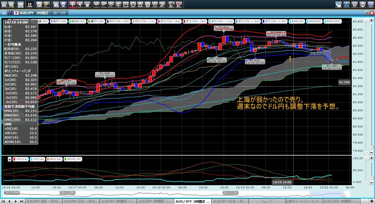 2012/10/20 - 417JADEさんの株式ブログ。タイトル:「△ 新規 決済 豪ドル/円 2012-10-19-1」 本文:12:1082.208エントリ17:58 82.120決済。上海が弱かったので売り。ドル円も週末なので調整下落があると予想した。