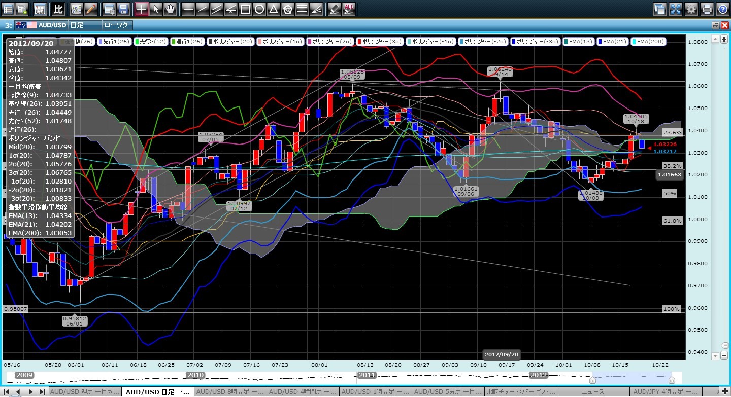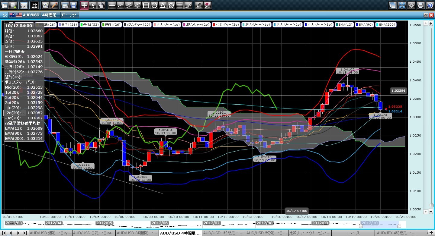 2012/10/20 - 417JADEさんの株式ブログ。タイトル:「△ 豪ドル/ドル 売り 2012-10-19-3」 本文:1.03546、18:04豪ドル/ドル売り。欧州株、ダウ先物下落。今週の急ピッチの上昇の調整下落を予想。4時間足移動平均200本線、1.0326付近をターゲット。