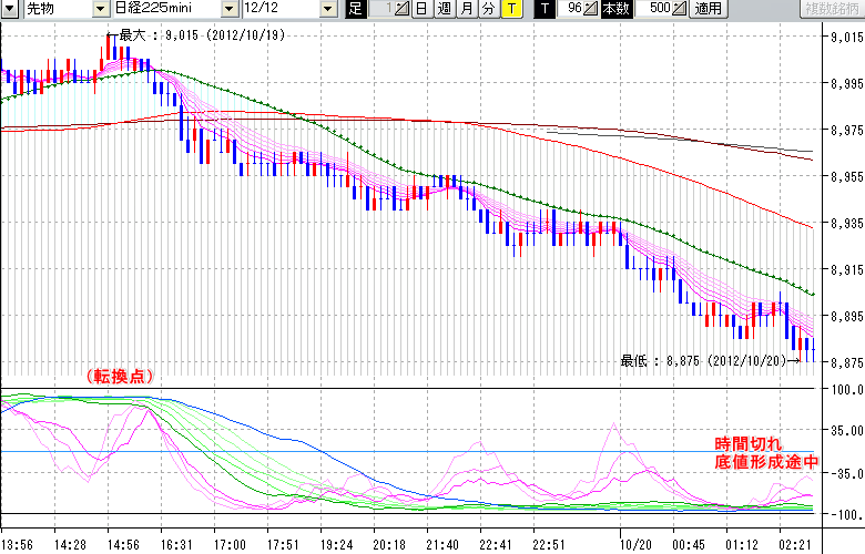 2012/10/20 - tensokoさんの株式ブログ。タイトル:「★10/19 夜間の株価の底値★」 本文:★10/19 夜間の株価の底値★ ↓クリックで画像拡大↓ ※指標ラインの密集点が天底・転換点を示します。指標の見方日経225mini先物チャート : 96ティック足底値 :