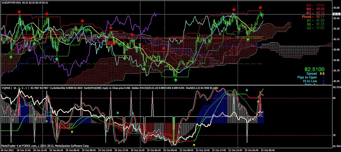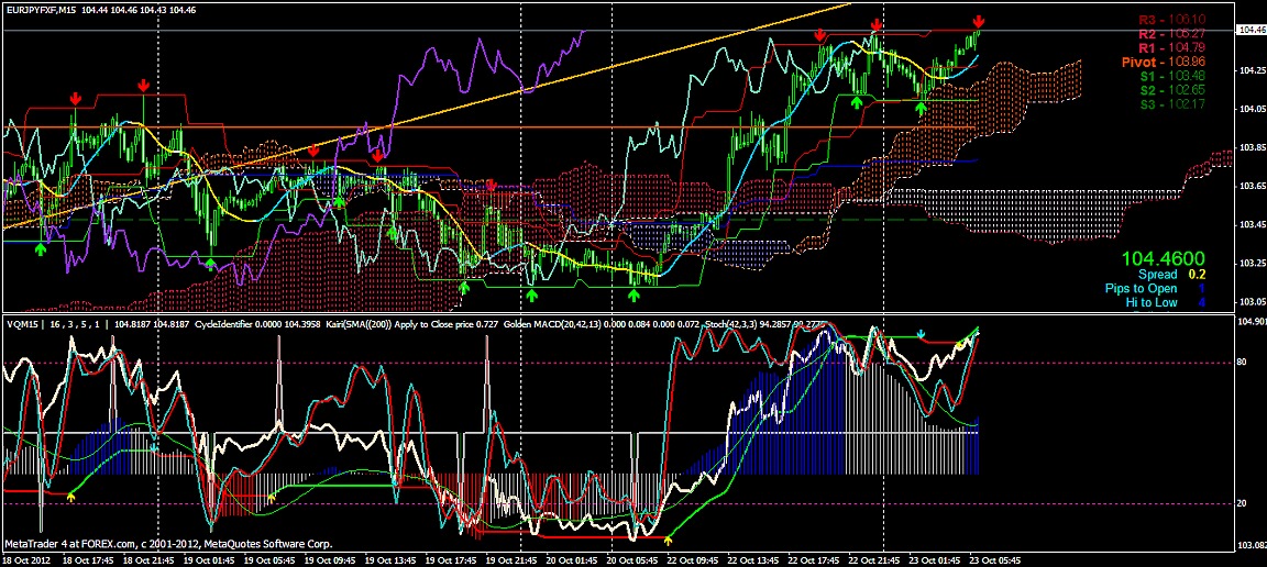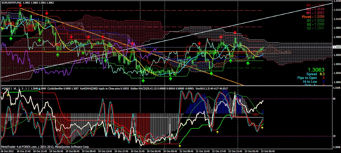 2012/10/23 - けろけろさんの株式ブログ。タイトル:「FX 2012-10-23 15分足」 本文:左からユーロドル ユーロ・円 豪ドル・円(時間足は真ん中に