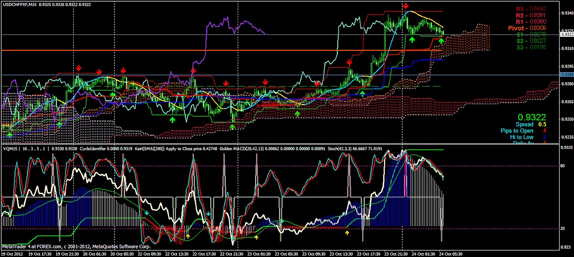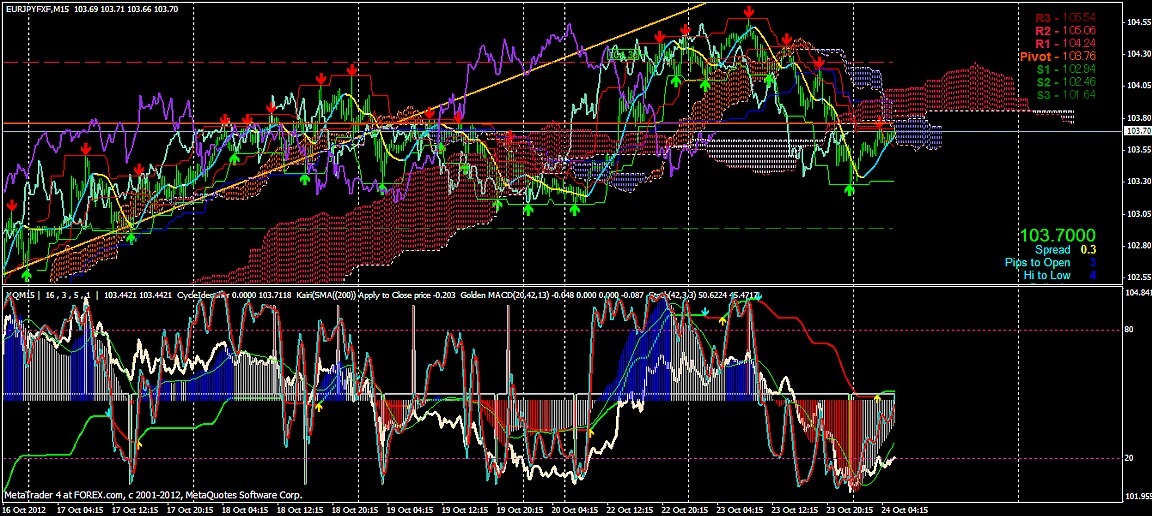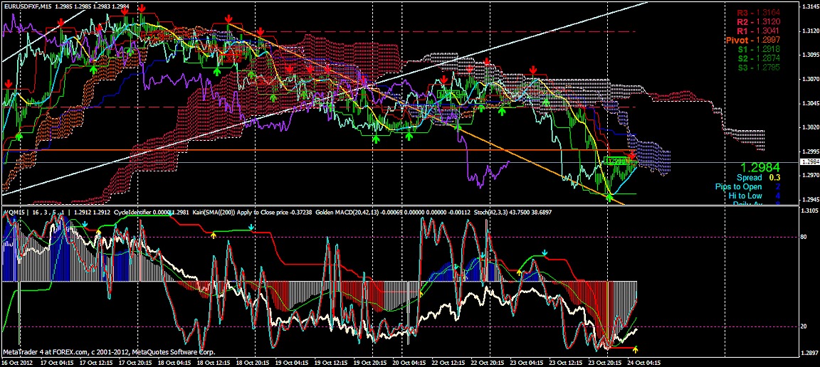 2012/10/24 - けろけろさんの株式ブログ。タイトル:「FX 2012-10-24 15分足」 本文:左からユーロドル ユーロ・円 豪ドル・円(時間足は真ん中に