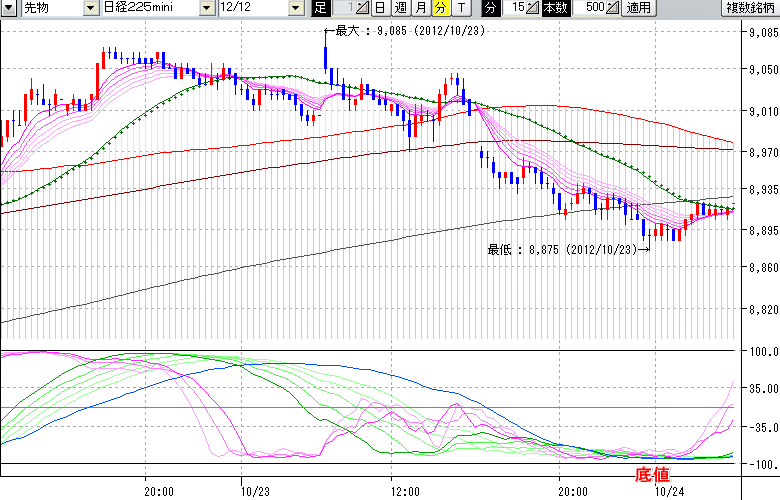 2012/10/24 - tensokoさんの株式ブログ。タイトル:「★10/23 夜間の株価の底値★」 本文:★10/23 夜間の株価の底値★ ↓クリックで画像拡大↓ ※指標ラインの密集点が天底・転換点を示します。指標の見方日経225mini先物チャート : 15分足底値 : 8875 (10/23