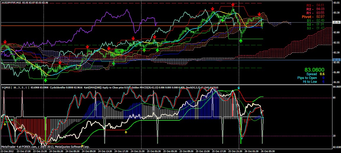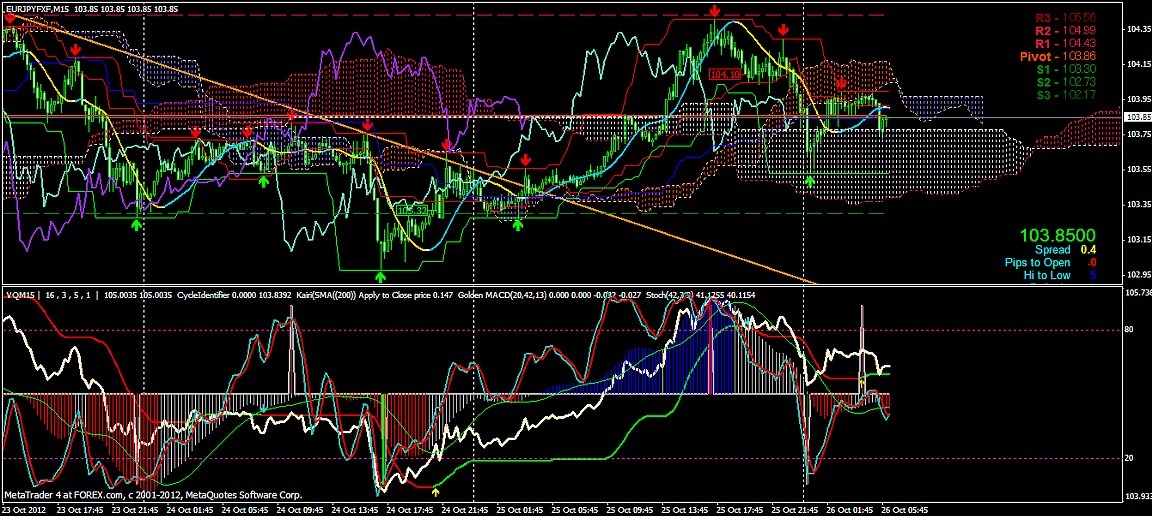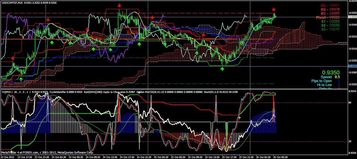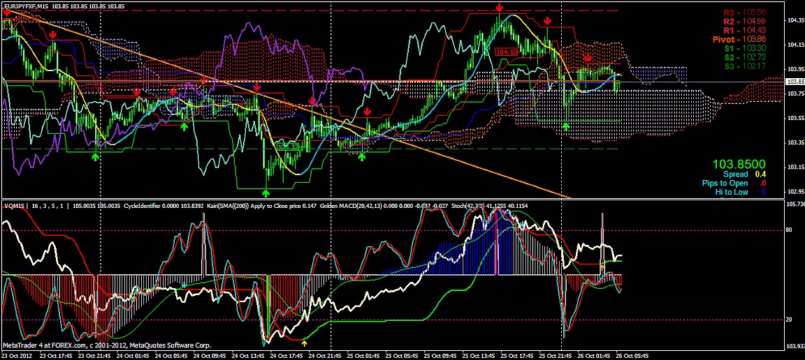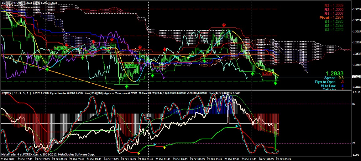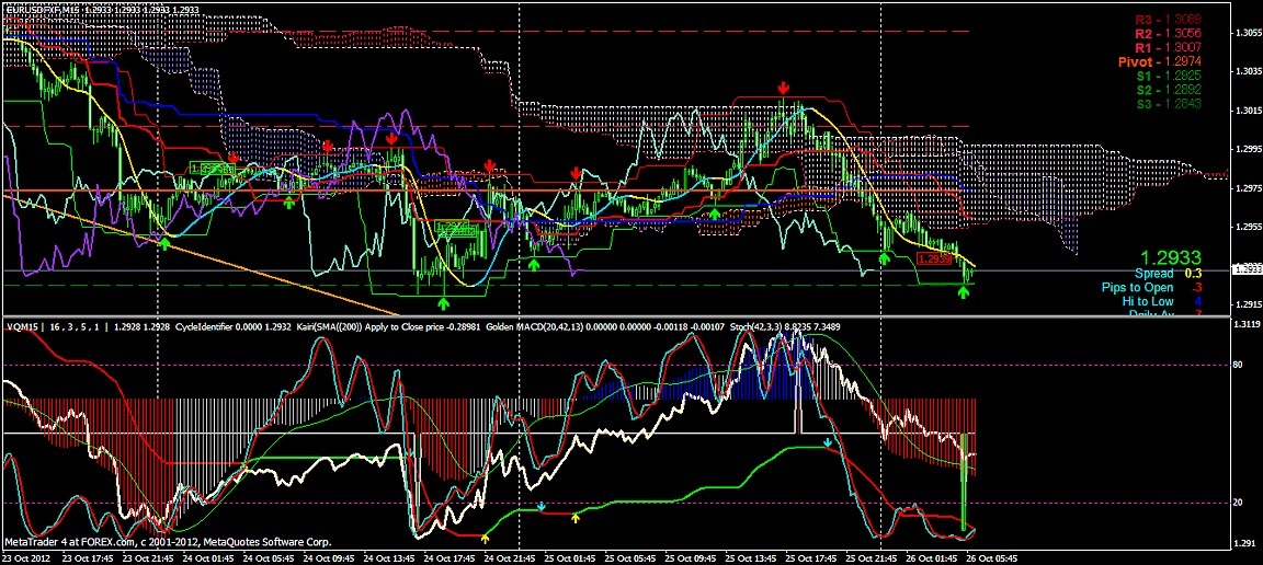 2012/10/26 - けろけろさんの株式ブログ。タイトル:「FX 2012-10-26 15分足」 本文:左からユーロドル ユーロ・円 豪ドル・円(時間足は真ん中に 5分足は真ん中から)っと気に留めてみよう~