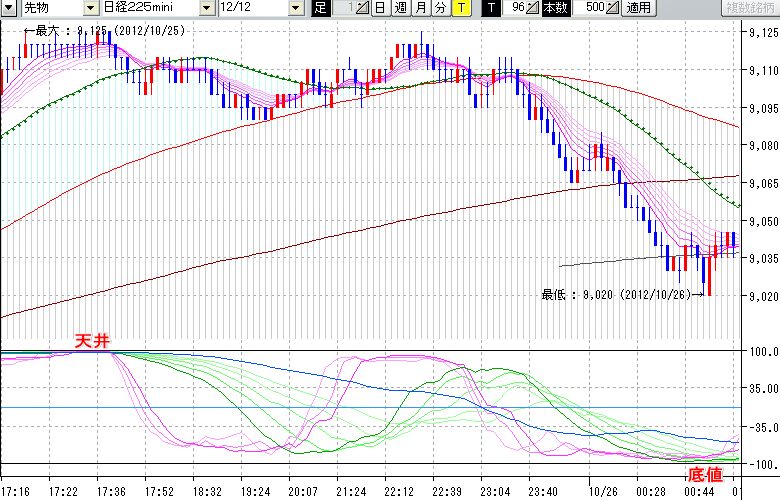 2012/10/26 - tensokoさんの株式ブログ。タイトル:「★10/25 夜間の株価の天底★」 本文:★10/25 夜間の株価の天底★ ↓クリックで画像拡大↓ ※指標ラインの密集点が天底・転換点を示します。指標の見方日経225mini先物チャート : 96ティック足天井 : 9125 (10/25