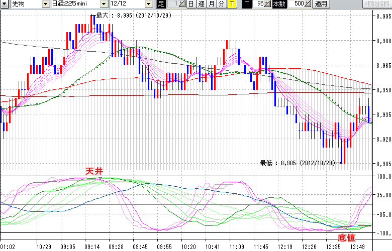 2012/10/29 - tensokoさんの株式ブログ。タイトル:「★10/29 日中の株価の天底★」 本文:★10/29 日中の株価の天底★ ↓クリックで画像拡大↓ ※指標ラインの密集点が天底・転換点を示します。指標の見方日経225mini先物チャート : 96ティック足天井 : 8995 (10/29