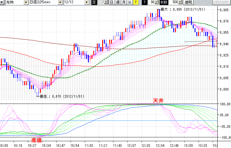 2012/11/01 - tensokoさんの株式ブログ。タイトル:「★11/1 日中の株価の天底★」 本文:★11/1 日中の株価の天底★ ↓クリックで画像拡大↓ ※指標ラインの密集点が天底・転換点を示します。指標の見方日経225mini先物チャート : 96ティック足底値 : 8870 (11/01