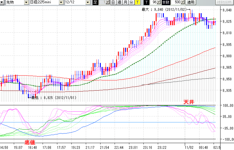 2012/11/02 - tensokoさんの株式ブログ。タイトル:「★11/1 夜間の株価の天底★」 本文:★11/1 夜間の株価の天底★ ↓クリックで画像拡大↓ ※指標ラインの密集点が天底・転換点を示します。指標の見方日経225mini先物チャート : 96ティック足底値 : 8925 (11/01
