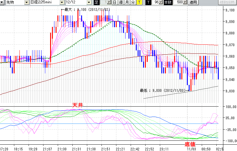 2012/11/03 - tensokoさんの株式ブログ。タイトル:「★11/2 夜間の株価の天底★」 本文:★11/2 夜間の株価の天底★ ↓クリックで画像拡大↓ ※指標ラインの密集点が天底・転換点を示します。指標の見方日経225mini先物チャート : 96ティック足天井 : 9100 (11/02