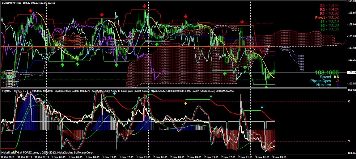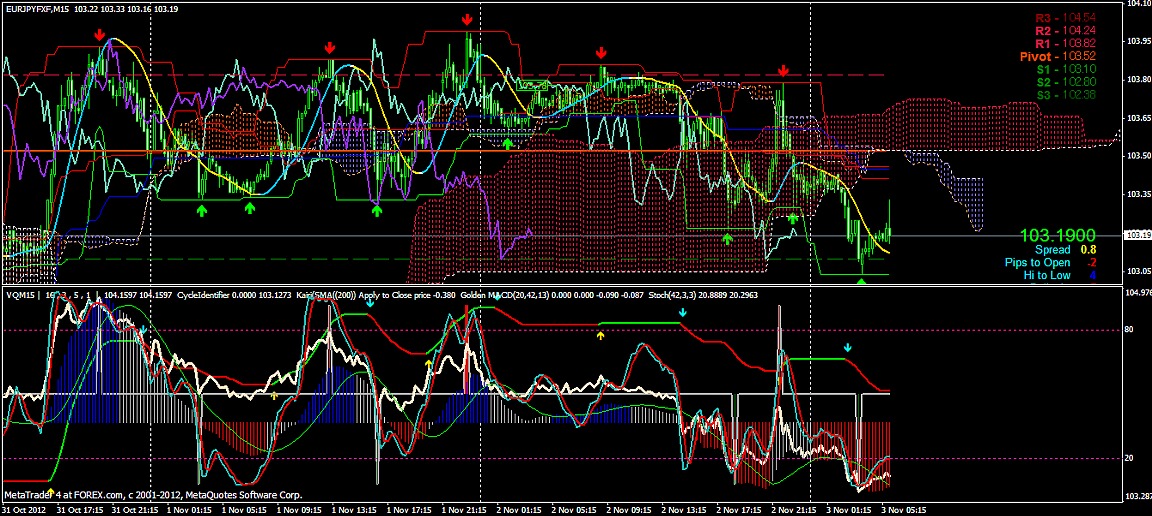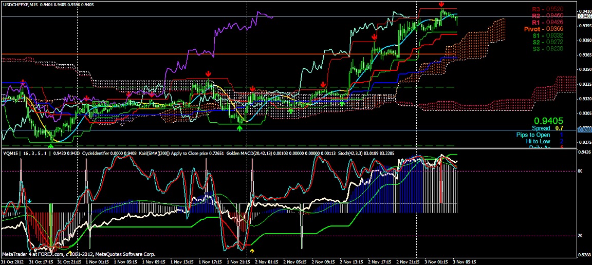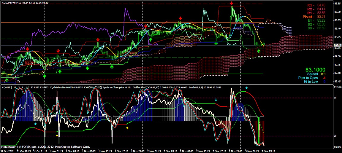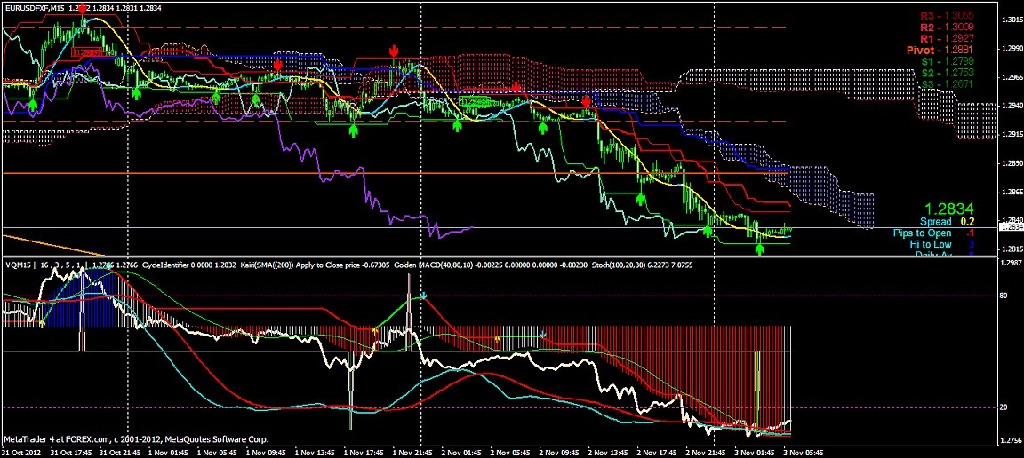 2012/11/05 - けろけろさんの株式ブログ。タイトル:「FX 2012-11-05 15分足」 本文:左からユーロドル ユーロ・円 豪ドル・円(時間足は真ん中に 5分足は真ん中から)っと気に留めてみよう~雇用統計。予想に反して上に吹いた ioi80円はもうそろそろ、さよーならー