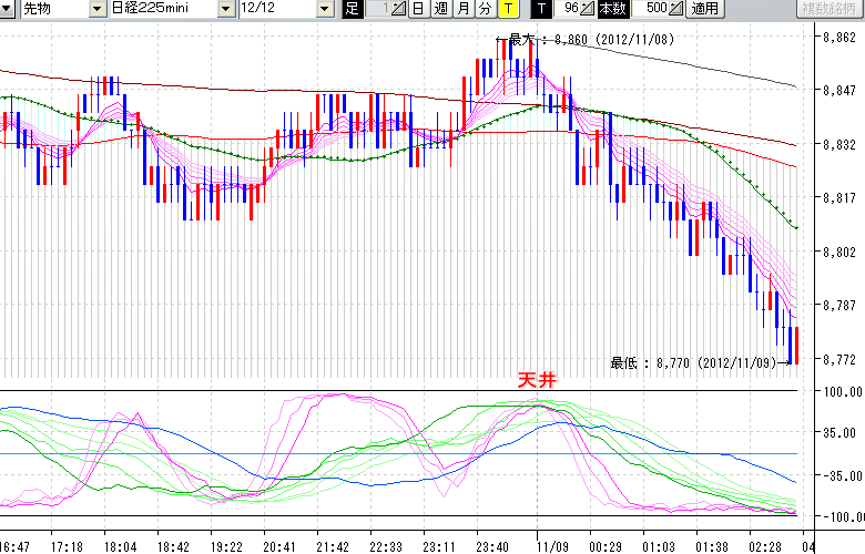 2012/11/09 - tensokoさんの株式ブログ。タイトル:「★11/8 夜間の株価の天底★」 本文:★11/8 夜間の株価の天底★ ↓クリックで画像拡大↓ ※指標ラインの密集点が天底・転換点を示します。指標の見方日経225mini先物チャート : 96ティック足天井 : 8860 (11/08