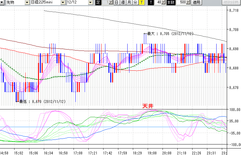 2012/11/13 - tensokoさんの株式ブログ。タイトル:「★11/12 夜間の株価の天井★」 本文:★11/12 夜間の株価の天井★ ↓クリックで画像拡大↓ ※指標ラインの密集点が天底・転換点を示します。指標の見方日経225mini先物チャート : 48ティック足天井 : 8705 (11/12