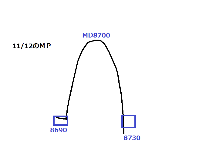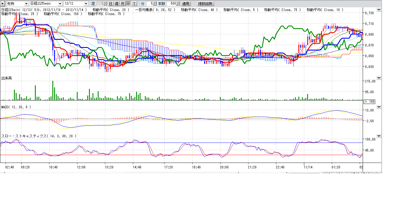 2012/11/13 - 月とスッポンさんの株式ブログ。タイトル:「2012/11/13 本日のチャート」 本文:特に書く事もないですねー・・・ 買うにも売るにも中途半端な位置です。 下値めど8520は変わらず。 とりあえずは8610のレッジはキープで買い戻しが入るか。