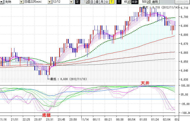 2012/11/14 - tensokoさんの株式ブログ。タイトル:「★11/13 夜間の株価の天底★」 本文:★11/13 夜間の株価の天底★ ↓クリックで画像拡大↓ ※指標ラインの密集点が天底・転換点を示します。指標の見方日経225mini先物チャート : 48ティック足底値 : 8630 (11/13