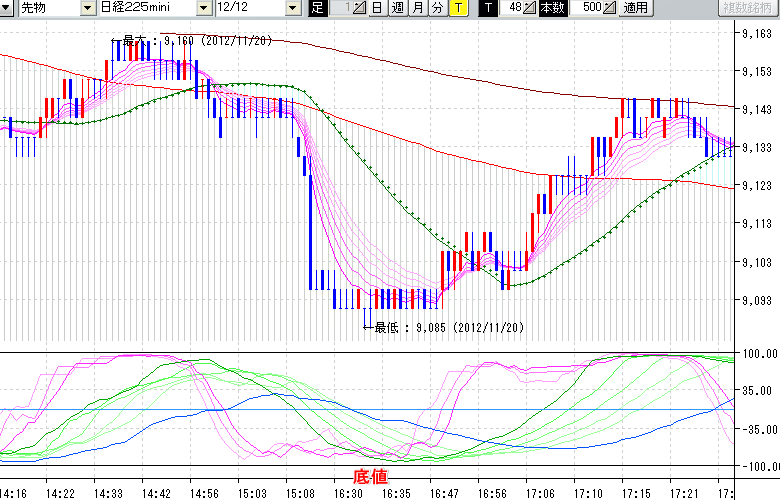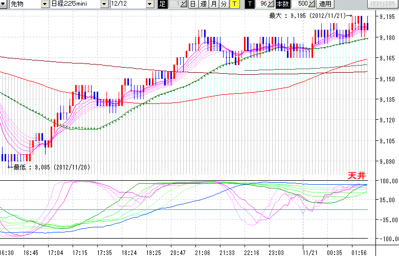 2012/11/21 - tensokoさんの株式ブログ。タイトル:「★11/20 夜間の株価の天底★」 本文:★11/20 夜間の株価の天底★ ↓クリックで画像拡大↓ ↓クリックで画像拡大↓ ※指標ラインの密集点が天底・転換点を示します。指標の見方日経225mini先物チャート(上) :