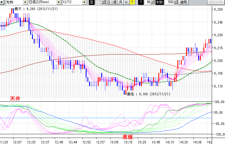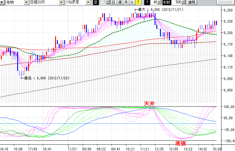 2012/11/21 - tensokoさんの株式ブログ。タイトル:「★11/21 日中の株価の天底★」 本文:★11/21 日中の株価の天底★ ↓クリックで画像拡大↓ ↓クリックで画像拡大↓ ※指標ラインの密集点が天底・転換点を示します。指標の見方日経225large先物チャート : つなぎ足