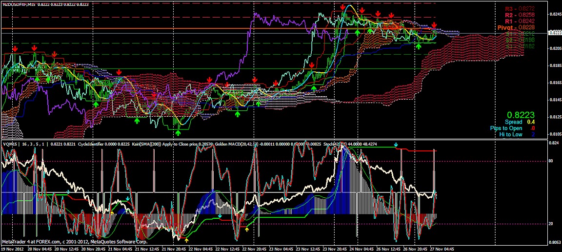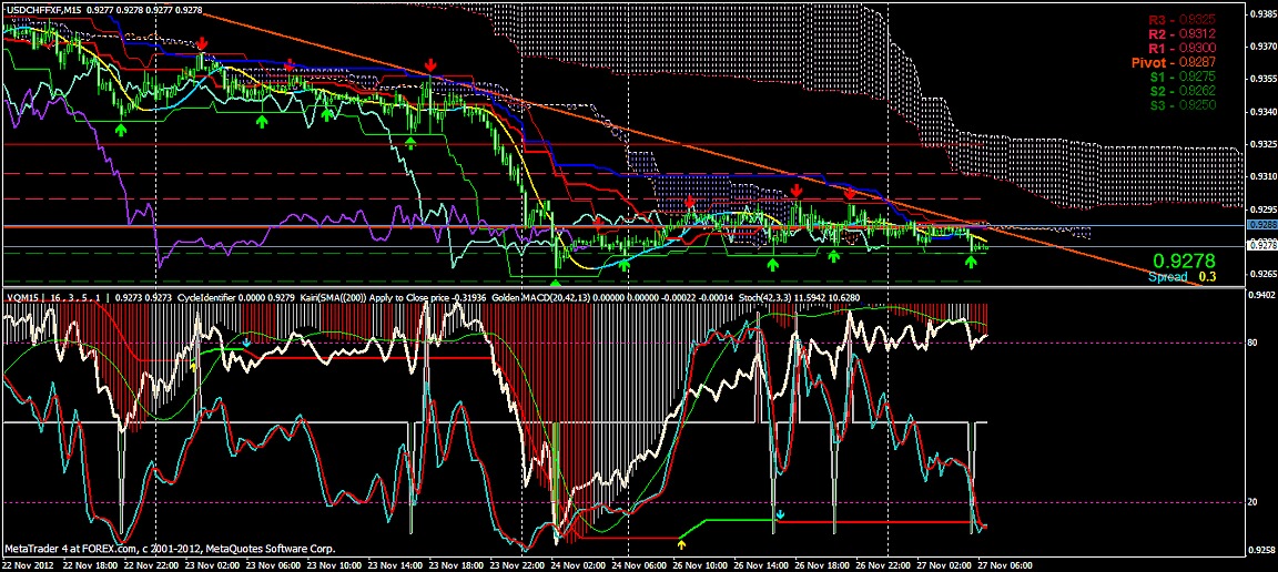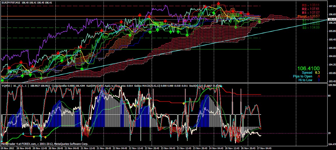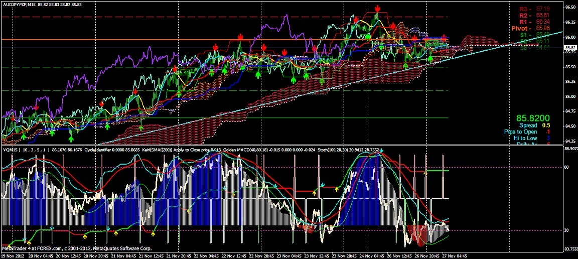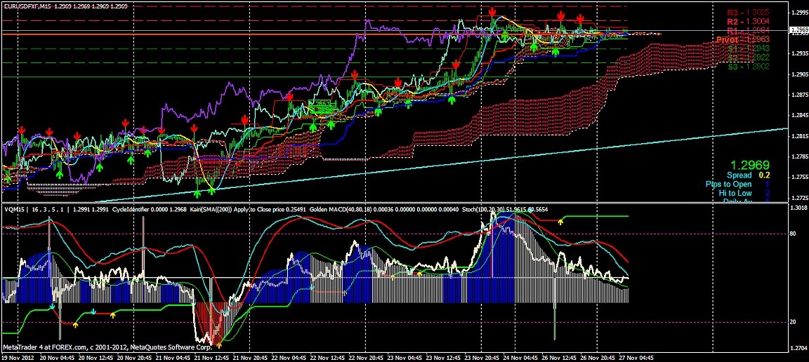 2012/11/27 - けろけろさんの株式ブログ。タイトル:「FX 2012-11-27 15分足」 本文:左からユーロドル ユーロ・円 豪ドル・円(時間足は真ん中に 5分足は真ん中から)っと気に留めてみよう~いよいよ 豪ドル・円とユーロ円が 15分の雲が1時間の雲に入ろうとしている~ 下落兆候か!