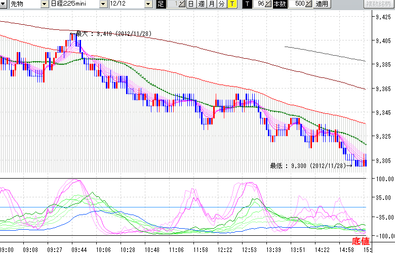 2012/11/28 - tensokoさんの株式ブログ。タイトル:「★11/28 日中の株価の天底★」 本文:★11/28 日中の株価の天底★ ↓クリックで画像拡大↓ ↓クリックで画像拡大↓ ※指標ラインの密集点が天底・転換点を示します。指標の見方日経225mini先物チャート(上) :