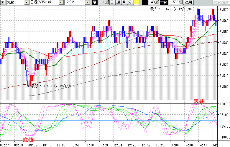 2012/12/06 - tensokoさんの株式ブログ。タイトル:「★日経9500台乗せで、そろそろ一旦調整か!?★」 本文:★12/6 日中の株価の天底★ ↓クリックで画像拡大↓ ※指標ラインの密集点が天底・転換点を示します。指標の見方日経225mini先物チャート : 48ティック足底値 : 9500 (12/06