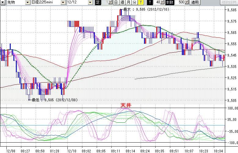 2012/12/10 - tensokoさんの株式ブログ。タイトル:「★12/10 日中の株価の天底★」 本文:★12/10 日中の株価の天底★ ↓クリックで画像拡大↓ ↓クリックで画像拡大↓ ※指標ラインの密集点が天底・転換点を示します。指標の見方日経225mini先物チャート(上) :