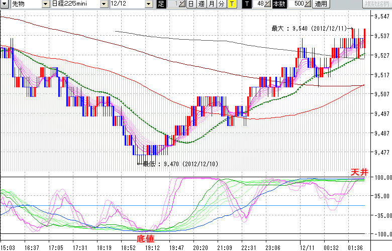2012/12/11 - tensokoさんの株式ブログ。タイトル:「★12/10 夜間の株価の天底★」 本文:★12/10 夜間の株価の天底★ ↓クリックで画像拡大↓ ※指標ラインの密集点が天底・転換点を示します。指標の見方日経225mini先物チャート : 48ティック足底値 : 9470 (12/10