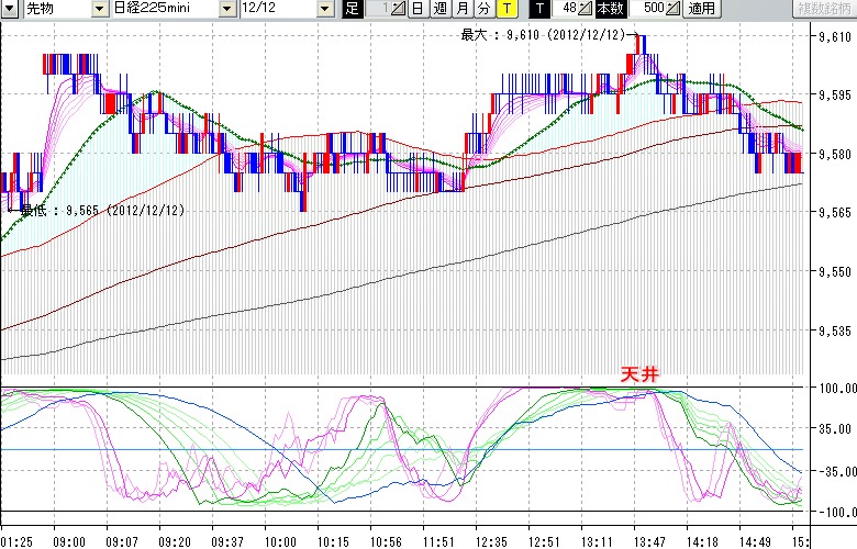 2012/12/12 - tensokoさんの株式ブログ。タイトル:「★12/12 日中の株価の天井★」 本文:★12/12 日中の株価の天井★ ↓クリックで画像拡大↓ ※指標ラインの密集点が天底・転換点を示します。指標の見方日経225mini先物チャート : 48ティック足天井 : 9610 (12/12