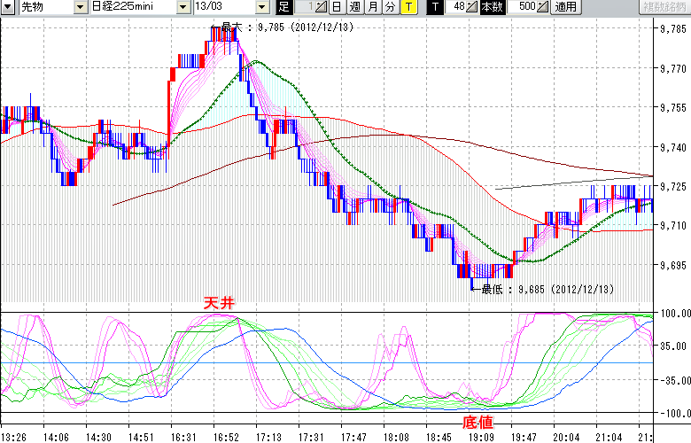 2012/12/14 - tensokoさんの株式ブログ。タイトル:「★12/13 夜間の株価の天底★」 本文:★12/13 夜間の株価の天底★ ↓クリックで画像拡大↓ ※指標ラインの密集点が天底・転換点を示します。指標の見方日経225mini先物チャート : 48ティック足天井 : 9785 (12/13