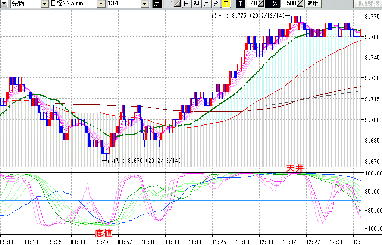 2012/12/14 - tensokoさんの株式ブログ。タイトル:「★12/14 日中の株価の天底★」 本文:★12/14 日中の株価の天底★ ↓クリックで画像拡大↓ ※指標ラインの密集点が天底・転換点を示します。指標の見方日経225mini先物チャート : 48ティック足底値 : 9670 (12/14