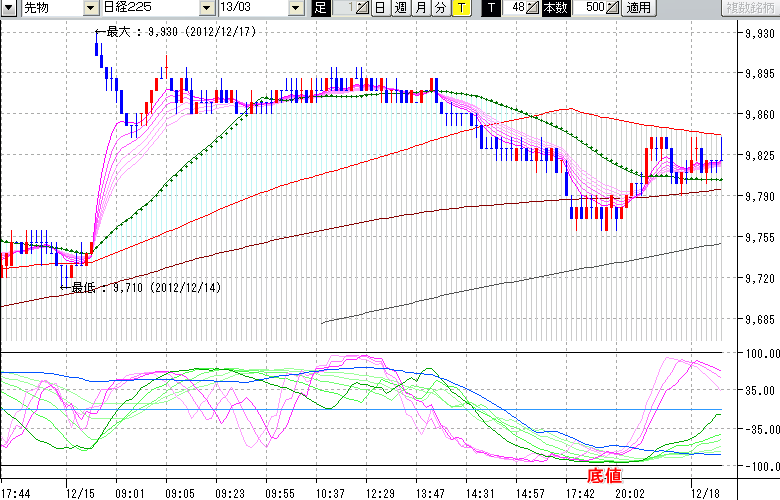 2012/12/18 - tensokoさんの株式ブログ。タイトル:「★12/17 夜間の株価の底値★」 本文:★12/17 夜間の株価の底値★ ↓クリックで画像拡大↓ ※指標ラインの密集点が天底・転換点を示します。指標の見方日経225large先物チャート : 48ティック足底値 : 9760 (12/17
