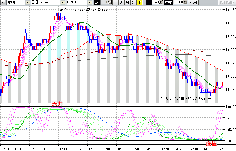 指標ラインの密集点が天底・転換点を示します。指標の見方