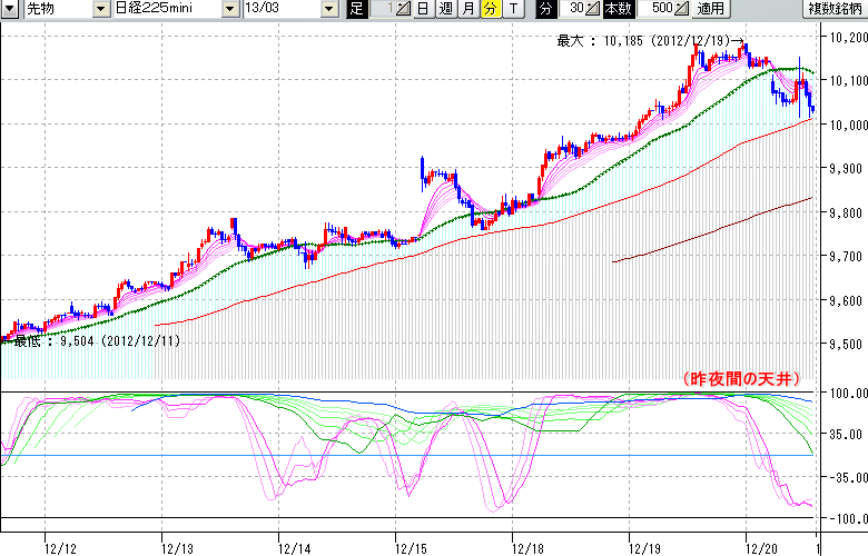 2012/12/20 - tensokoさんの株式ブログ。タイトル:「★騰落レシオ、史上最高の異常相場★」 本文:★騰落レシオ、史上最高の異常相場も昨夜間で一旦ピークアウトか!?★ ★12/20 日中の株価の天底★ ↓クリックで画像拡大↓  ↓クリックで画像拡大↓
