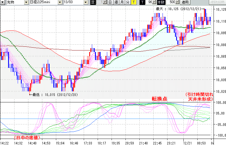 2012/12/21 - tensokoさんの株式ブログ。タイトル:「★12/21 夜間の株価の転換点★」 本文:★12/21 夜間の株価の転換点★ ↓クリックで画像拡大↓ ※指標ラインの密集点が天底・転換点を示します。指標の見方日経225mini先物チャート : 96ティック足転換点: 10120