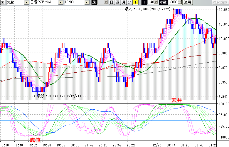 2012/12/22 - tensokoさんの株式ブログ。タイトル:「★12/21 夜間の株価の天底★」 本文:★12/21 夜間の株価の天底★ ↓クリックで画像拡大↓ ※指標ラインの密集点が天底・転換点を示します。指標の見方日経225mini先物チャート : 48ティック足底値 : 9940 (12/21