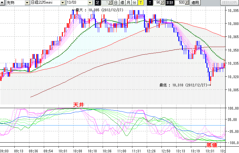 2012/12/27 - tensokoさんの株式ブログ。タイトル:「★12/27 日中の株価の天底★」 本文:★12/27 日中の株価の天底★ ↓クリックで画像拡大↓ ※指標ラインの密集点が天底・転換点を示します。指標の見方日経225mini先物チャート : 96ティック足天井 : 10395 (12/27
