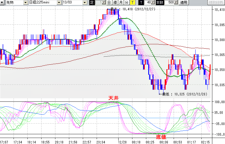 2012/12/28 - tensokoさんの株式ブログ。タイトル:「★12/27 夜間の株価の天底★」 本文:★12/27 夜間の株価の天底★ ↓クリックで画像拡大↓ ※指標ラインの密集点が天底・転換点を示します。指標の見方日経225mini先物チャート : 48ティック足天井 : 10410 (12/27