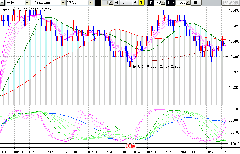 2012/12/28 - tensokoさんの株式ブログ。タイトル:「★12/28 日中の株価の天底★」 本文:★12/28 日中の株価の天底★ ↓クリックで画像拡大↓ ↓クリックで画像拡大↓ ※指標ラインの密集点が天底・転換点を示します。指標の見方日経225mini先物チャート(上) :