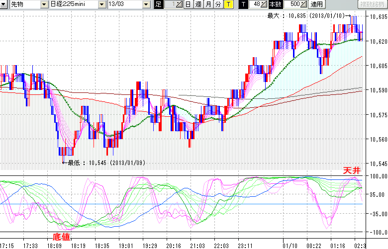 2013/01/10 - tensokoさんの株式ブログ。タイトル:「★1/9 夜間の株価の天底★」 本文:★1/9 夜間の株価の天底★ ↓クリックで画像拡大↓ ※指標ラインの密集点が天底・転換点を示します。指標の見方日経225mini先物チャート : 48ティック足底値 : 10545 (1/09