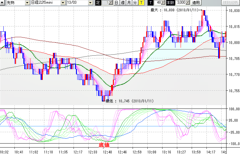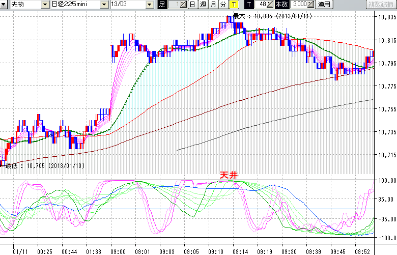 2013/01/11 - tensokoさんの株式ブログ。タイトル:「★1/11 日中の株価の天底★」 本文:★1/11 日中の株価の天底★ ↓クリックで画像拡大↓ ↓クリックで画像拡大↓ ※指標ラインの密集点が天底・転換点を示します。指標の見方日経225mini先物チャート(上) :