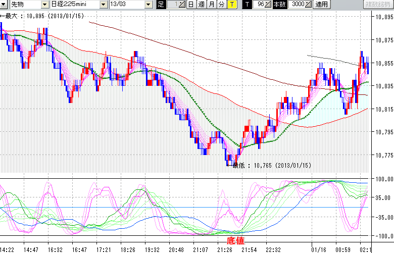 2013/01/16 - tensokoさんの株式ブログ。タイトル:「★1/15 夜間の株価の底値★」 本文:★1/15 夜間の株価の底値★ ↓クリックで画像拡大↓ ※指標ラインの密集点が天底・転換点を示します。指標の見方日経225mini先物チャート : 96ティック足底値 : 10765 (1/15