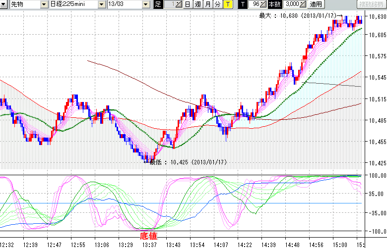 2013/01/17 - tensokoさんの株式ブログ。タイトル:「★1/17 日中の株価の底値★」 本文:★1/17 日中の株価の底値★ ↓クリックで画像拡大↓ ※指標ラインの密集点が天底・転換点を示します。指標の見方日経225mini先物チャート : 96ティック足底値 : 10425 (1/17
