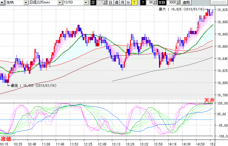 2013/01/18 - tensokoさんの株式ブログ。タイトル:「★1/18 日中の株価の天底★」 本文:★1/18 日中の株価の天底★ ↓クリックで画像拡大↓ ↓クリックで画像拡大↓ ※指標ラインの密集点が天底・転換点を示します。指標の見方日経225mini先物チャート(上) :
