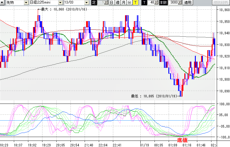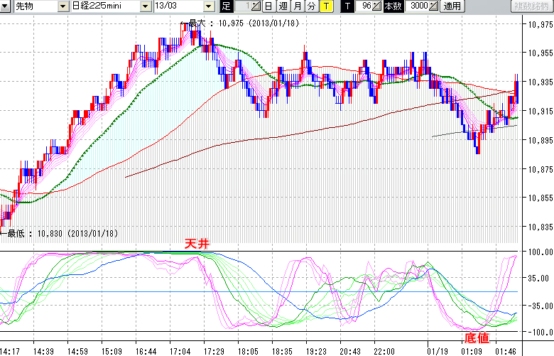 2013/01/19 - tensokoさんの株式ブログ。タイトル:「★1/18 夜間の株価の天底★」 本文:★1/18 夜間の株価の天底★ ↓クリックで画像拡大↓ ↓クリックで画像拡大↓ ※指標ラインの密集点が天底・転換点を示します。指標の見方日経225mini先物チャート(上) :
