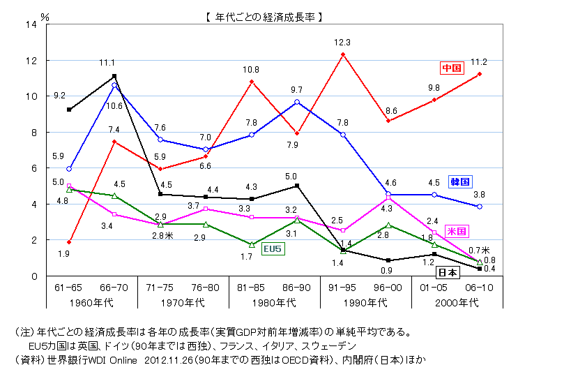 添付図は各国経済成長率の年代毎の平均値の比較図です。