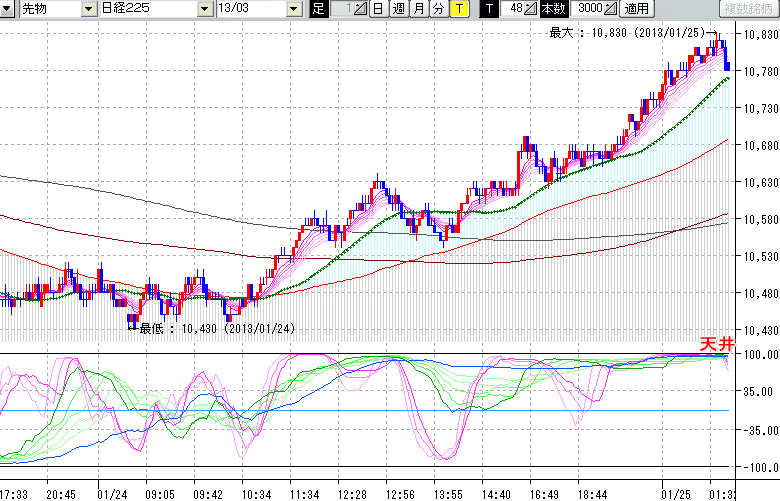 2013/01/25 - tensokoさんの株式ブログ。タイトル:「★1/24 夜間の株価の天井★」 本文:★1/24 夜間の株価の天井★ ↓クリックで画像拡大↓ ※指標ラインの密集点が天底・転換点を示します。指標の見方日経225large先物チャート : 48ティック足天井 : 10830 (1/25