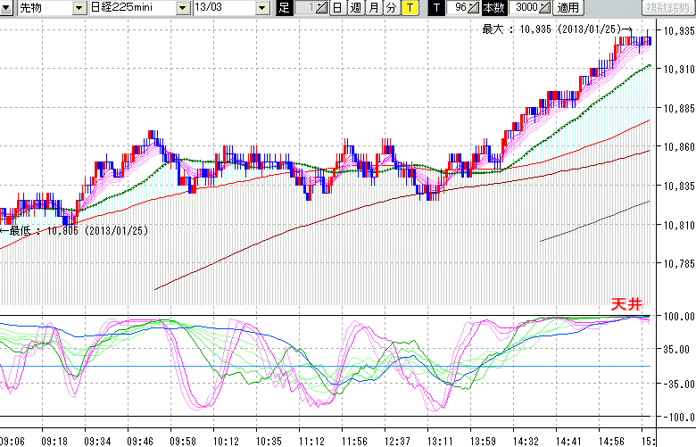 2013/01/25 - tensokoさんの株式ブログ。タイトル:「★1/25 日中の株価の天井★」 本文:★1/25 日中の株価の天井★ ↓クリックで画像拡大↓ ※指標ラインの密集点が天底・転換点を示します。指標の見方日経225mini先物チャート : 96ティック足天井 : 10935 (1/25