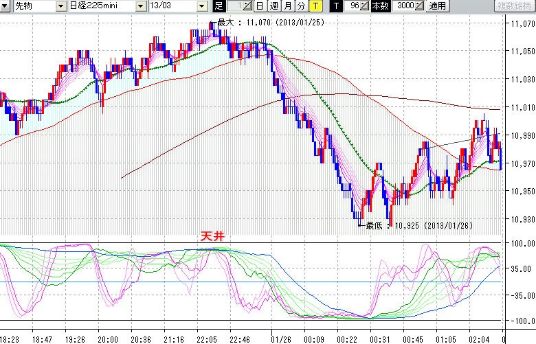 2013/01/26 - tensokoさんの株式ブログ。タイトル:「★1/25 夜間の株価の天井★」 本文:★1/25 夜間の株価の天井★ ↓クリックで画像拡大↓ ↓クリックで画像拡大↓ ※指標ラインの密集点が天底・転換点を示します。指標の見方日経225mini先物チャート(上) :