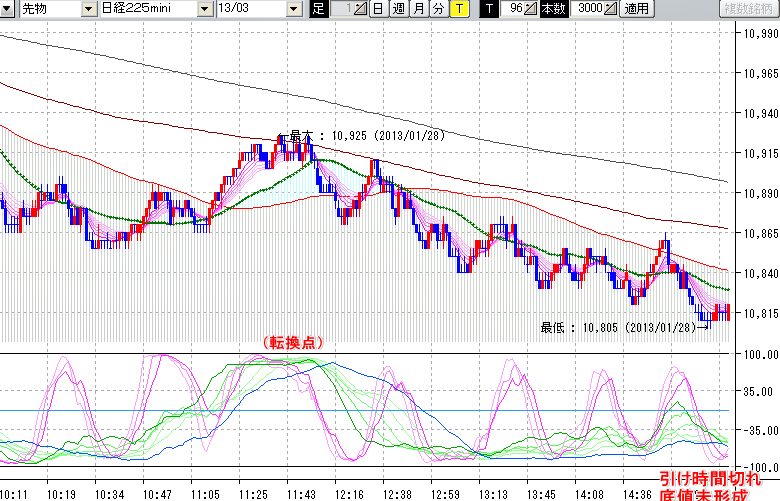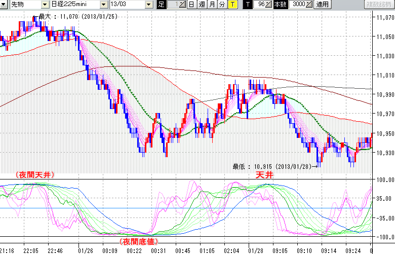 2013/01/28 - tensokoさんの株式ブログ。タイトル:「★1/28 日中の株価の天底★」 本文:★1/28 日中の株価の天底★ ↓クリックで画像拡大↓ ↓クリックで画像拡大↓ ※指標ラインの密集点が天底・転換点を示します。指標の見方日経225mini先物チャート(上) :