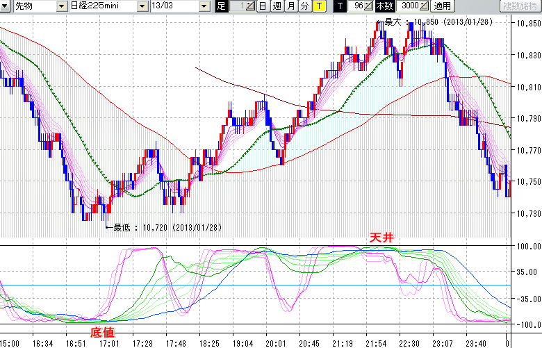 2013/01/29 - tensokoさんの株式ブログ。タイトル:「★1/28 夜間の株価の天底★」 本文:★1/28 夜間の株価の天底★ ↓クリックで画像拡大↓ ※指標ラインの密集点が天底・転換点を示します。指標の見方日経225mini先物チャート : 96ティック足底値 : 10720 (1/28
