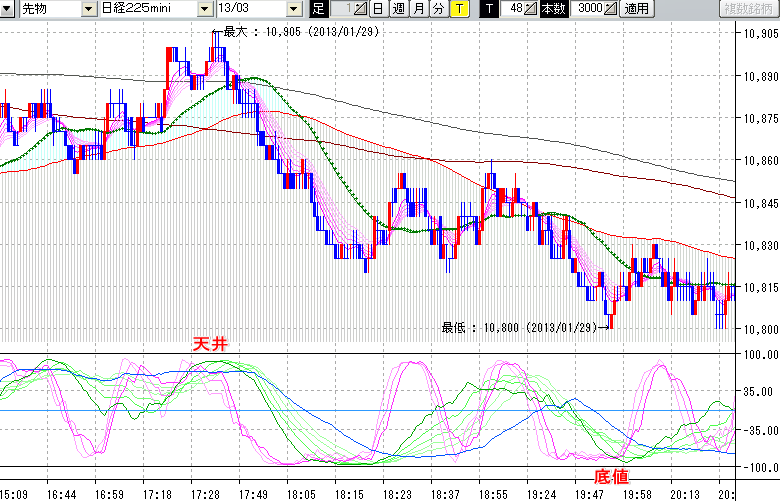 2013/01/30 - tensokoさんの株式ブログ。タイトル:「★1/29 夜間の株価の天底★」 本文:★1/29 夜間の株価の天底★ ↓クリックで画像拡大↓ ※指標ラインの密集点が天底・転換点を示します。指標の見方日経225mini先物チャート : 48ティック足天井 : 10905 (1/29