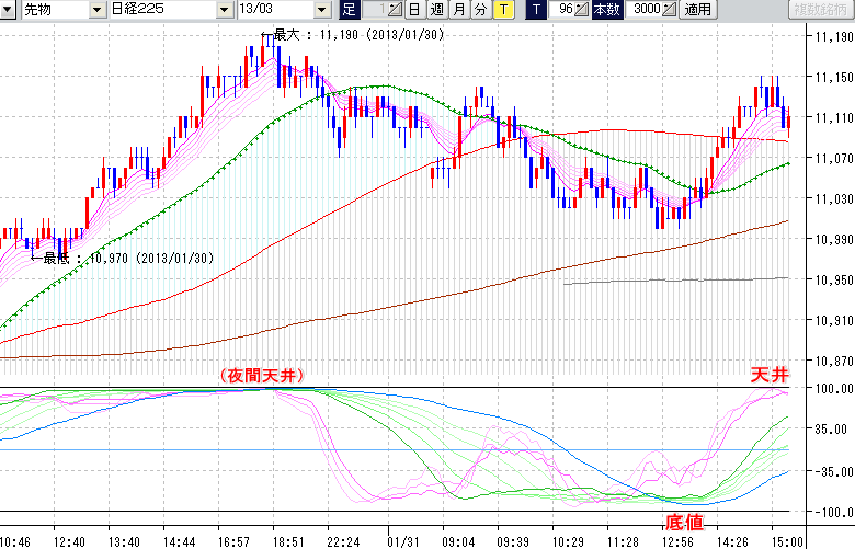 2013/01/31 - tensokoさんの株式ブログ。タイトル:「★1/31 日中の株価の天底★」 本文:★1/31 日中の株価の天底★ ↓クリックで画像拡大↓  ↓クリックで画像拡大↓ ※指標ラインの密集点が天底・転換点を示します。指標の見方日経225large先物チャート(上) :